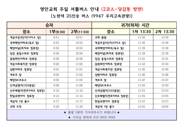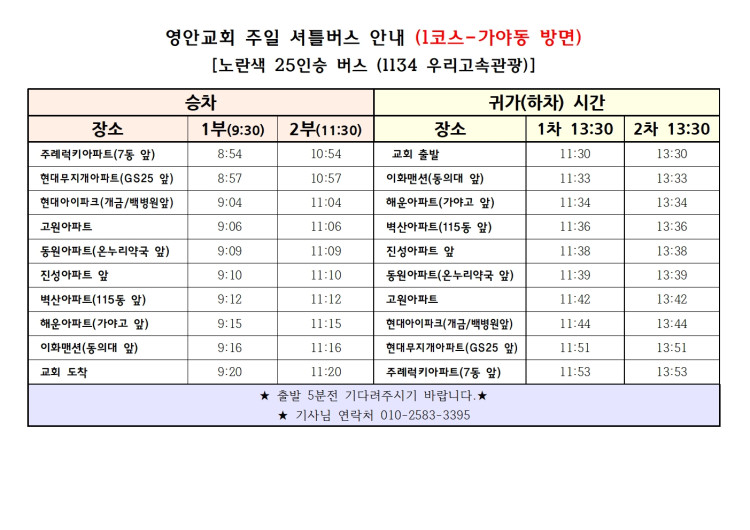 교회 셔틀 버스 운행 시간표
