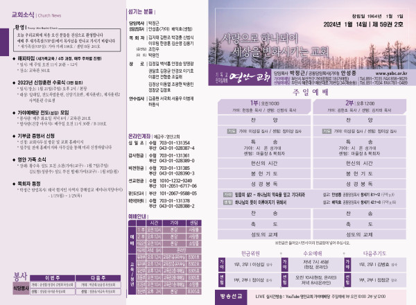2024년 1월 14일 주보 (가야예배당) 페이지 정보 작성자 관리지기 작성일24-01-13 11:12 조회3,095회 댓글0건 관련링크 목록 본문 2024년 1월 14일 주보 (가야예배당) 댓글목록 등록된 댓글이 없습니다. 목록