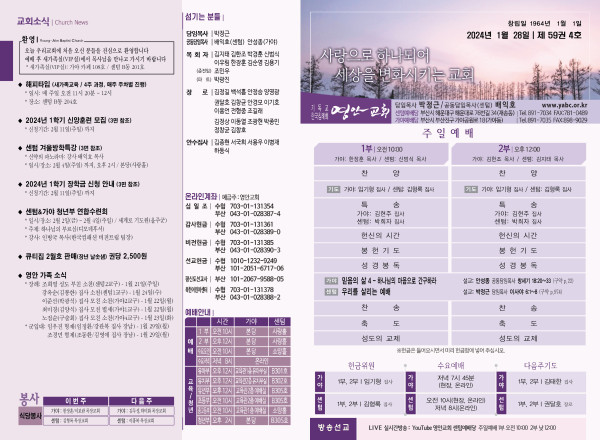 2024년 1월 28일 주보 (센텀예배당) 페이지 정보 작성자 관리지기 작성일24-01-27 11:07 조회3,044회 댓글0건 관련링크 목록 본문 2024년 1월 28일 주보 (센텀예배당) 댓글목록 등록된 댓글이 없습니다. 목록