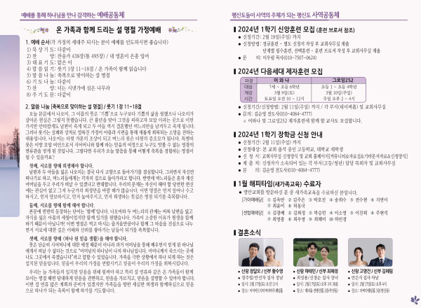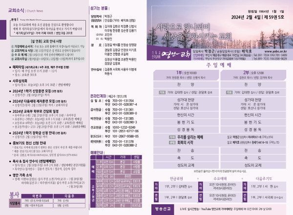 2024년 2월 4일 주보 (가야예배당) 페이지 정보 작성자 관리지기 작성일24-02-03 11:12 조회3,078회 댓글0건 관련링크 목록 본문 2024년 2월 4일 주보 (가야예배당 ) 댓글목록 등록된 댓글이 없습니다. 목록