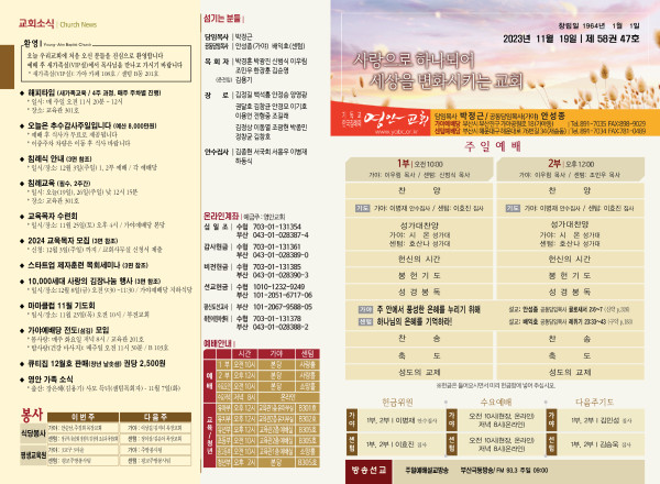2023년 11월 19일 주보 (가야예배당) 페이지 정보 작성자 관리지기 작성일23-11-18 11:12 조회3,189회 댓글0건 관련링크 목록 본문 * 2023년 11월 19일 주보 (가야예배당) 댓글목록 등록된 댓글이 없습니다. 목록
