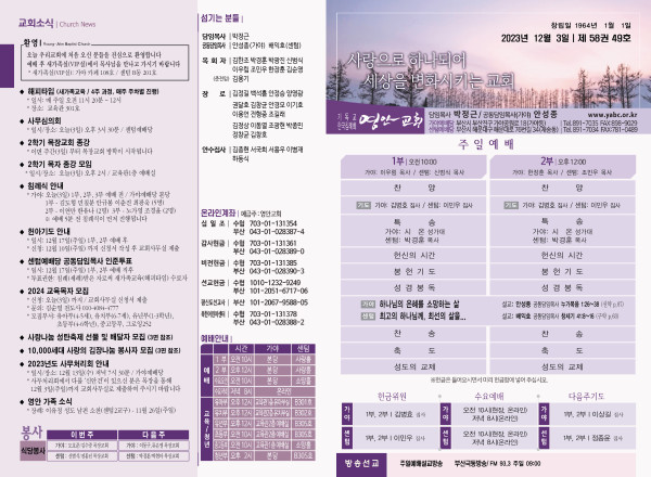 2023년 12월 3일 주보 (가야예배당) 페이지 정보 작성자 관리지기 작성일23-12-02 12:09 조회3,536회 댓글0건 관련링크 목록 본문 * 2023년 12월 3일 주보 (가야예배당) 댓글목록 등록된 댓글이 없습니다. 목록