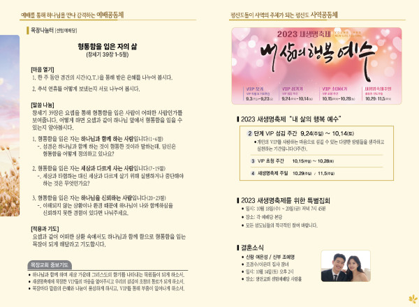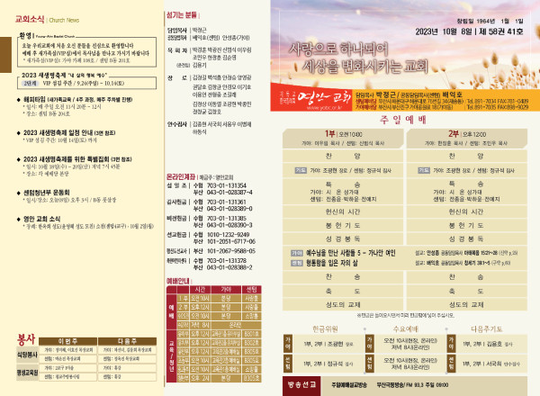 2023년 10월 8일 주보 (센텀예배당) 페이지 정보 작성자 관리지기 작성일23-10-07 10:53 조회3,228회 댓글0건 관련링크 목록 본문 2023년 10월 8일 주보 (센텀예배당) 댓글목록 등록된 댓글이 없습니다. 목록