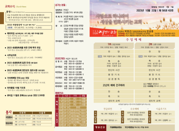 2023년 10월 22일 주보 (가야예배당) 페이지 정보 작성자 관리지기 작성일23-10-21 10:18 조회3,368회 댓글0건 관련링크 목록 본문 * 2023년 10월 22일 주보 (가야예배당) 댓글목록 등록된 댓글이 없습니다. 목록