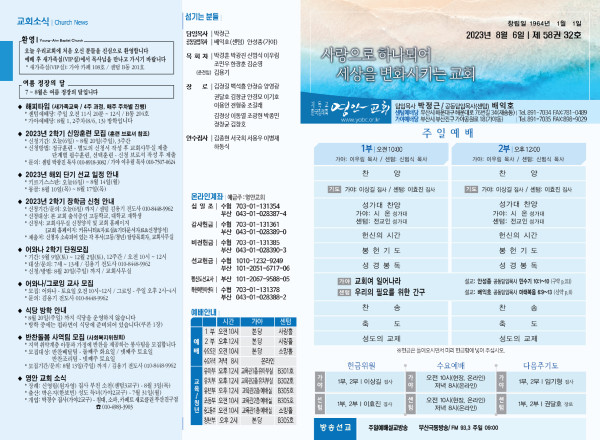 2023년 8월 6일 주보 (센텀예배당) 페이지 정보 작성자 관리지기 작성일23-08-05 09:53 조회3,361회 댓글0건 관련링크 목록 본문 2023년 8월 6일 주보 (센텀예배당) 댓글목록 등록된 댓글이 없습니다. 목록