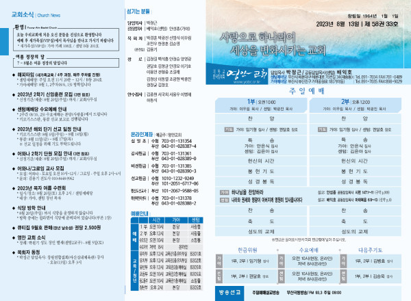 2023년 8월 13일 주보 (센텀예배당) 페이지 정보 작성자 관리지기 작성일23-08-12 10:17 조회3,362회 댓글0건 관련링크 목록 본문 2023년 8월 13일 주보 (센텀예배당) 댓글목록 등록된 댓글이 없습니다. 목록