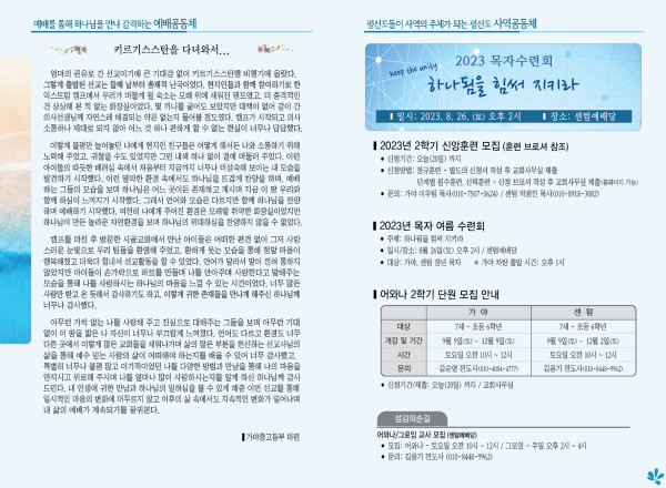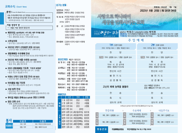 2023년 8월 20일 주보 (센텀예배당) 페이지 정보 작성자 관리지기 작성일23-08-19 10:09 조회3,377회 댓글0건 관련링크 목록 본문 2023년 8월 20일 주보 (센텀예배당) 댓글목록 등록된 댓글이 없습니다. 목록