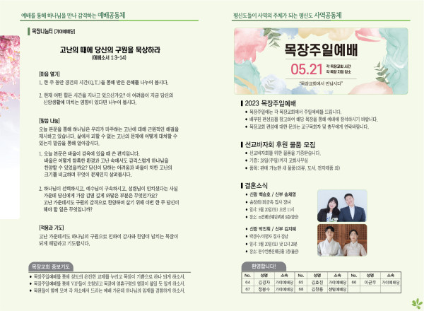 2023년 5월 14일 주보 (가야예배당) 페이지 정보 작성자 관리지기 작성일23-05-13 11:05 조회3,720회 댓글0건 관련링크 목록 본문 * 2023년 5월 14일 주보 (가야예배당) 댓글목록 등록된 댓글이 없습니다. 목록