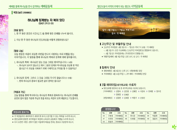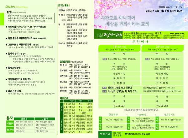 2023년 4월 2일 주보 (센텀예배당) 페이지 정보 작성자 관리지기 작성일23-04-01 11:09 조회3,747회 댓글0건 관련링크 목록 본문 2023년 4월 2일 주보 (센텀예배당) 댓글목록 등록된 댓글이 없습니다. 목록