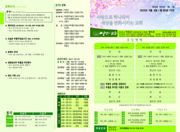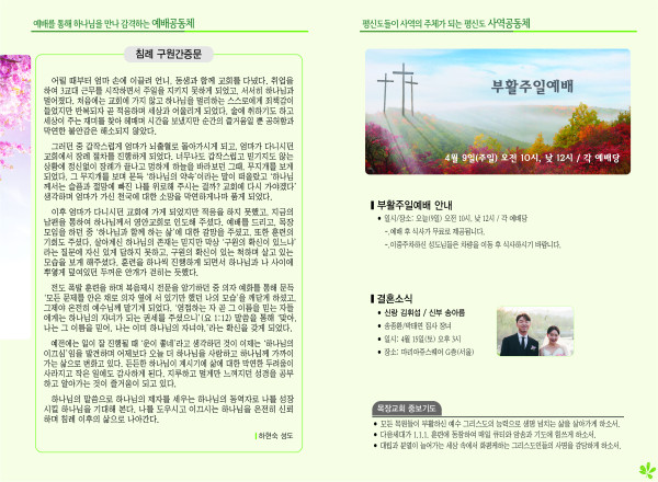 2023년 4월 9일 주보 (센텀예배당) 페이지 정보 작성자 관리지기 작성일23-04-08 11:12 조회3,679회 댓글0건 관련링크 목록 본문 2023년 4월 9일 주보 (센텀예배당) 댓글목록 등록된 댓글이 없습니다. 목록