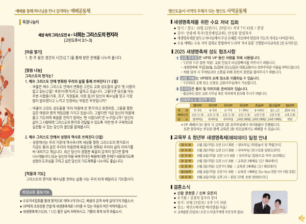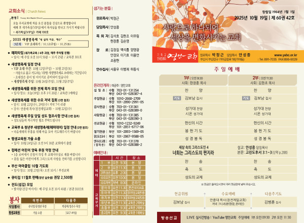 2025년 10월 19일 주보 페이지 정보 작성자 관리지기 작성일25-10-18 10:40 조회1,141회 댓글0건 관련링크 목록 본문 2025년 10월 19일 주보 댓글목록 등록된 댓글이 없습니다. 목록