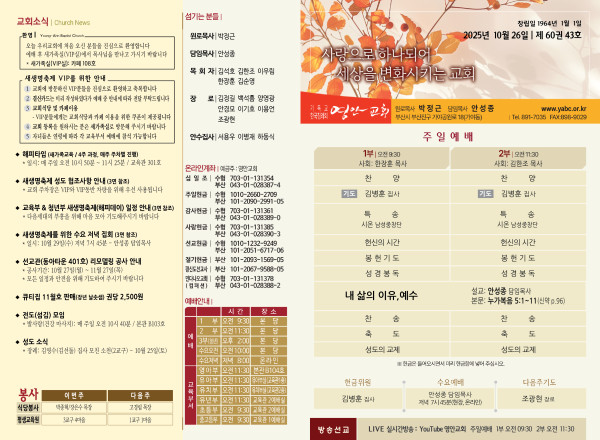 2025년 10월 26일 주보 페이지 정보 작성자 관리지기 작성일25-10-25 10:43 조회1,141회 댓글0건 관련링크 목록 본문 2025년 10월 26일 주보 댓글목록 등록된 댓글이 없습니다. 목록