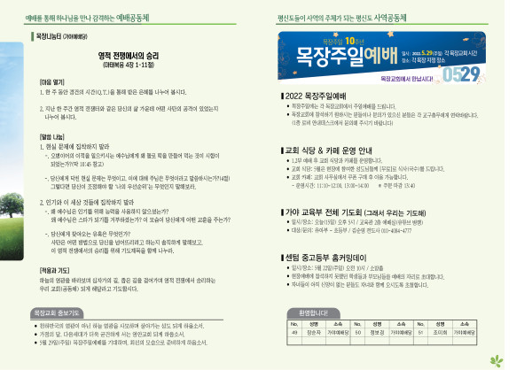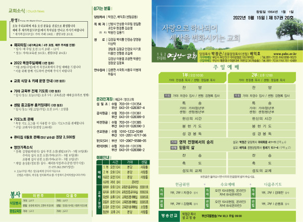 2022년 5월 15일 주보 (가야예배당) 페이지 정보 작성자 관리지기 작성일22-05-14 11:43 조회4,787회 댓글0건 관련링크 목록 본문 * 2022년 5월 15일 주보 (가야예배당) 댓글목록 등록된 댓글이 없습니다. 목록