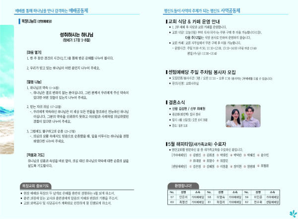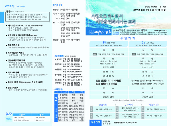 2022년 6월 5일 주보 (센텀예배당) 페이지 정보 작성자 관리지기 작성일22-06-04 11:35 조회4,536회 댓글0건 관련링크 목록 본문 2022년 6월 5일 주보 (센텀예배당) 댓글목록 등록된 댓글이 없습니다. 목록