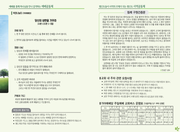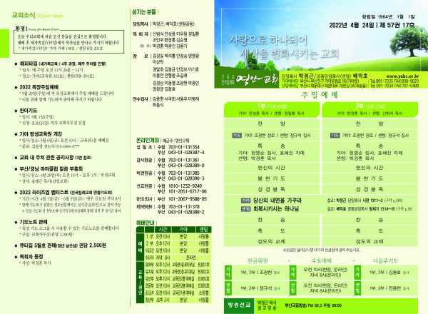 2022년 4월 24일 주보 (가야예배당) 페이지 정보 작성자 관리지기 작성일22-04-23 11:45 조회5,070회 댓글0건 관련링크 목록 본문 2022년 4월 24일 주보 (가야예배당) 댓글목록 등록된 댓글이 없습니다. 목록