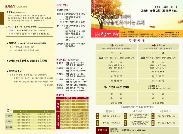 2021년 10월 3일 주보 페이지 정보 작성자 관리지기 작성일21-10-02 11:41 조회5,977회 댓글0건 관련링크 목록 본문 2021년 10월 3일 주보 댓글목록 등록된 댓글이 없습니다. 목록