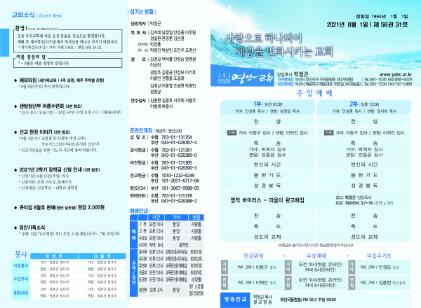 2021년 8월 1일 주보 페이지 정보 작성자 관리지기 작성일21-07-31 11:52 조회6,083회 댓글0건 관련링크 목록 본문 2021년 8월 1일 주보 댓글목록 등록된 댓글이 없습니다. 목록