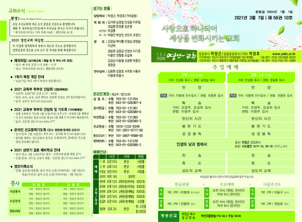 2021년 3월 7일 주보 페이지 정보 작성자 관리지기 작성일21-03-06 11:10 조회6,939회 댓글0건 관련링크 목록 본문 2021년 3월 7일 주보 댓글목록 등록된 댓글이 없습니다. 목록