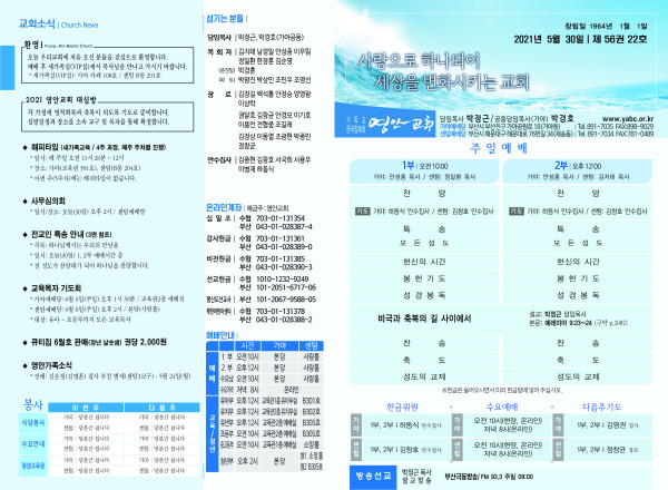 2021년 5월 30일 주보 페이지 정보 작성자 관리지기 작성일21-05-29 11:01 조회6,201회 댓글0건 관련링크 목록 본문 *2021년 5월 30일 주보 댓글목록 등록된 댓글이 없습니다. 목록