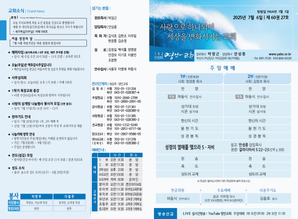 2025년 7월 6일 주보 페이지 정보 작성자 관리지기 작성일25-07-05 11:32 조회1,729회 댓글0건 관련링크 목록 본문 2025년 7월 6일 주보 댓글목록 등록된 댓글이 없습니다. 목록