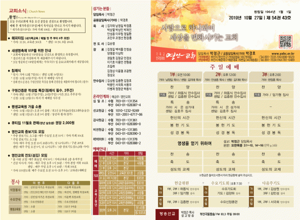 2019년 10월 27일 주보 페이지 정보 작성자 관리지기 작성일19-10-26 12:16 조회8,437회 댓글0건 관련링크 목록 본문 [2019년 10월 27일 주보] 댓글목록 등록된 댓글이 없습니다. 목록