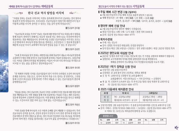 2025년 2월 9일 주보 페이지 정보 작성자 관리지기 작성일25-02-08 11:09 조회2,217회 댓글0건 관련링크 목록 본문 2025년 2월 9일 주보 댓글목록 등록된 댓글이 없습니다. 목록