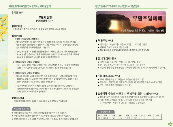 2025년 4월 20일 주보 페이지 정보 작성자 관리지기 작성일25-04-19 11:02 조회1,954회 댓글0건 관련링크 목록 본문 2025년 4월 20일 주보 댓글목록 등록된 댓글이 없습니다. 목록