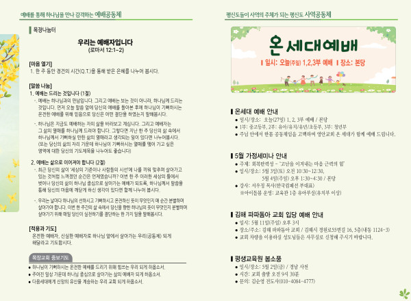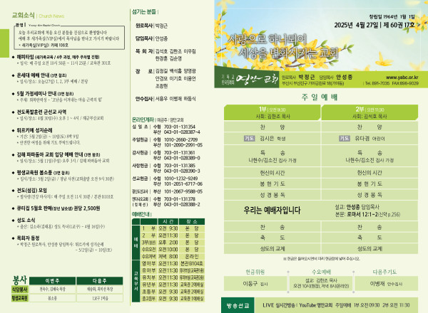 2025년 4월 27일 주보 페이지 정보 작성자 관리지기 작성일25-04-26 10:49 조회1,903회 댓글0건 관련링크 목록 본문 2025년 4월 27일 주보 댓글목록 등록된 댓글이 없습니다. 목록