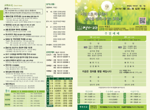 2017년 4월 2일 주보 페이지 정보 작성자 관리지기 작성일17-04-01 13:02 조회14,164회 댓글0건 관련링크 목록 본문 2017년 4월 2일 주보 댓글목록 등록된 댓글이 없습니다. 목록