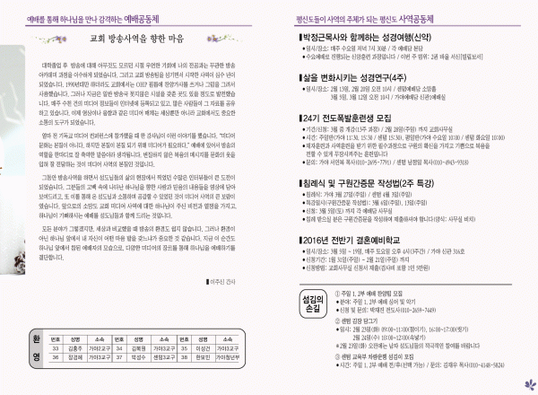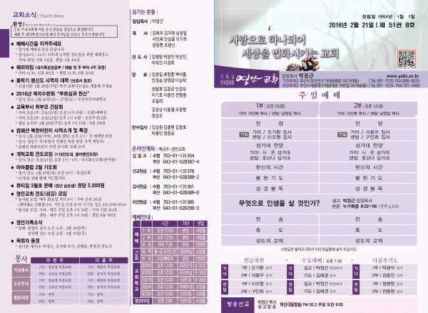 2016년 2월 21일 주보 페이지 정보 작성자 영안교회 작성일16-02-20 12:01 조회11,290회 댓글0건 관련링크 목록 본문 2016년 2월 21일 주보 댓글목록 등록된 댓글이 없습니다. 목록
