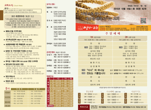 2015년 10월 18일 주보 페이지 정보 작성자 영안교회 작성일15-10-21 14:27 조회10,035회 댓글0건 관련링크 목록 본문 2015년 10월 18일 주보 댓글목록 등록된 댓글이 없습니다. 목록