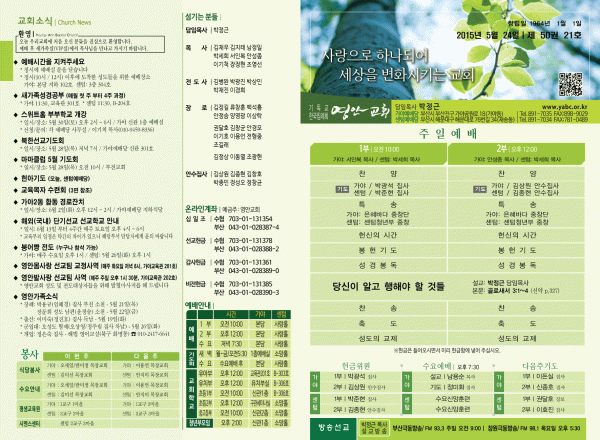 2015년 5월 24일 주보 페이지 정보 작성자 yabc 작성일15-05-23 00:00 조회9,911회 댓글0건 관련링크 목록 본문 2015년 5월 24일 주보 댓글목록 등록된 댓글이 없습니다. 목록