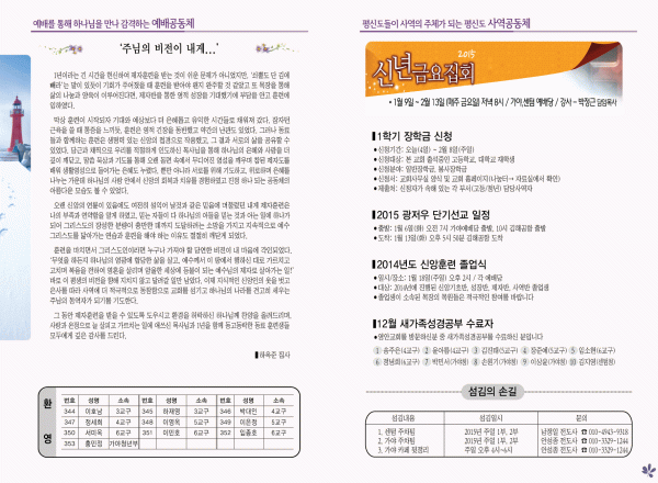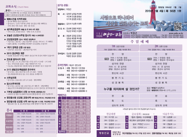 2015년 1월 4일 주보 페이지 정보 작성자 yabc 작성일15-01-03 00:00 조회11,607회 댓글0건 관련링크 목록 본문 2015년 1월 4일 주보 댓글목록 등록된 댓글이 없습니다. 목록