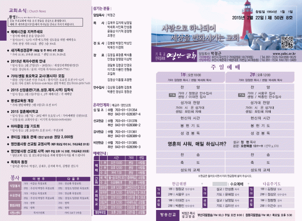 2015년 2월 22일 주보 페이지 정보 작성자 yabc 작성일15-02-21 00:00 조회10,175회 댓글0건 관련링크 목록 본문 2015년 2월 22일 주보 댓글목록 등록된 댓글이 없습니다. 목록