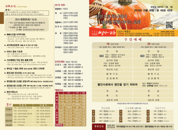 2014년 10월 26일 주보 페이지 정보 작성자 yabc 작성일14-10-25 00:00 조회11,450회 댓글0건 관련링크 목록 본문 2014년 10월 26일 주보 댓글목록 등록된 댓글이 없습니다. 목록