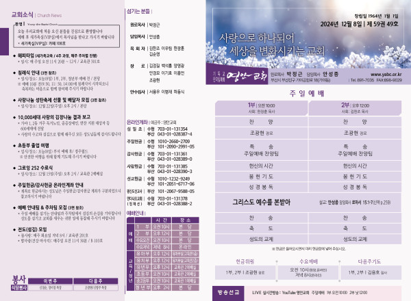 2024년 12월 8일 주보 (가야예배당) 페이지 정보 작성자 관리지기 작성일24-12-07 11:09 조회2,289회 댓글0건 관련링크 목록 본문 2024년 12월 8일 주보 (가야예배당) 댓글목록 등록된 댓글이 없습니다. 목록
