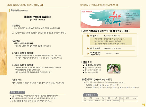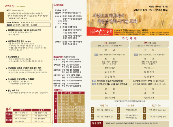 2024년 10월 6일 주보 (센텀예배당) 페이지 정보 작성자 관리지기 작성일24-10-05 10:44 조회2,183회 댓글0건 관련링크 목록 본문 2024년 10월 6일 주보 (센텀예배당) 댓글목록 등록된 댓글이 없습니다. 목록