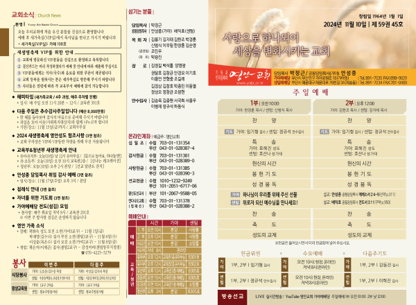 2024년 11월 10일 주보 (가야예배당) 페이지 정보 작성자 관리지기 작성일24-11-09 11:28 조회2,310회 댓글0건 관련링크 목록 본문 2024년 11월 10일 주보 (가야예배당) 댓글목록 등록된 댓글이 없습니다. 목록