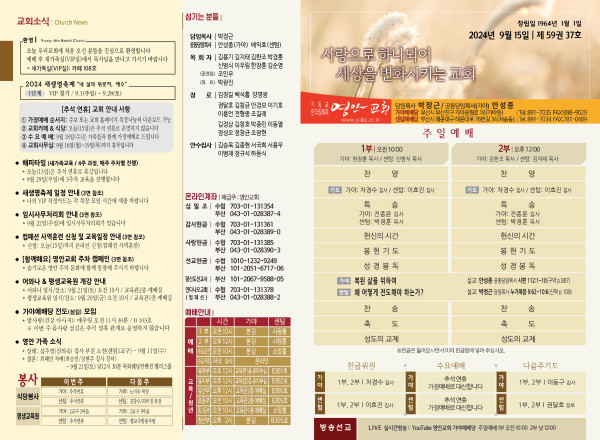 2024년 9월 15일 주보 (가야예배당) 페이지 정보 작성자 관리지기 작성일24-09-14 11:07 조회2,419회 댓글0건 관련링크 목록 본문 2024년 9월 15일 주보 (가야예배당) 댓글목록 등록된 댓글이 없습니다. 목록