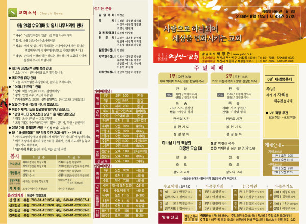 2008년 9월 14일 주보 페이지 정보 작성자 yabc 작성일08-09-12 00:00 조회11,109회 댓글0건 관련링크 목록 본문 2008년 9월 14일 주보 댓글목록 등록된 댓글이 없습니다. 목록