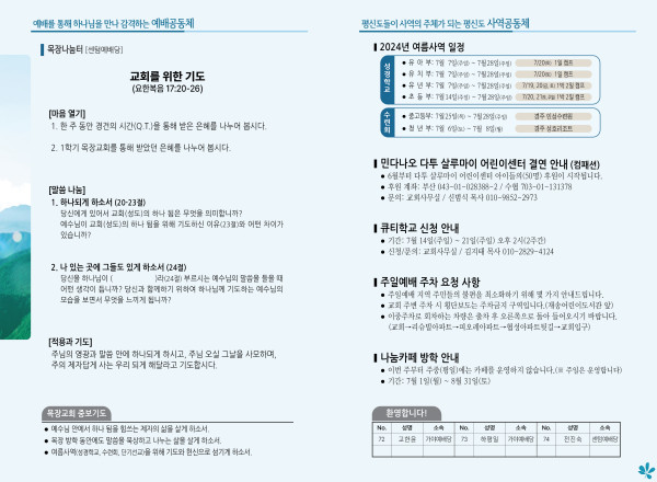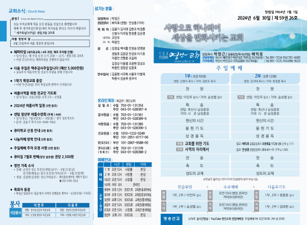 2024년 6월 30일 주보 (센텀예배당) 페이지 정보 작성자 관리지기 작성일24-06-29 11:14 조회2,510회 댓글0건 관련링크 목록 본문 2024년 6월 30일 주보 (센텀예배당) 댓글목록 등록된 댓글이 없습니다. 목록