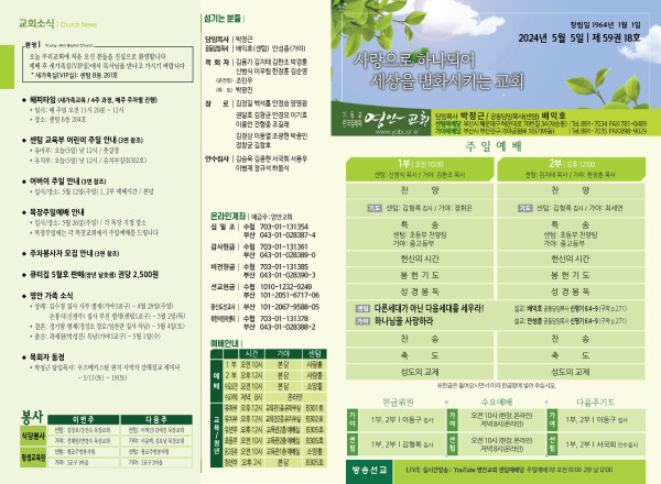 2024년 5월 5일 주보 (센텀예배당) 페이지 정보 작성자 관리지기 작성일24-05-04 10:48 조회2,572회 댓글0건 관련링크 목록 본문 2024년 5월 5일 주보 (센텀예배당) 댓글목록 등록된 댓글이 없습니다. 목록