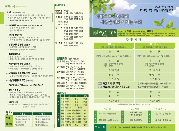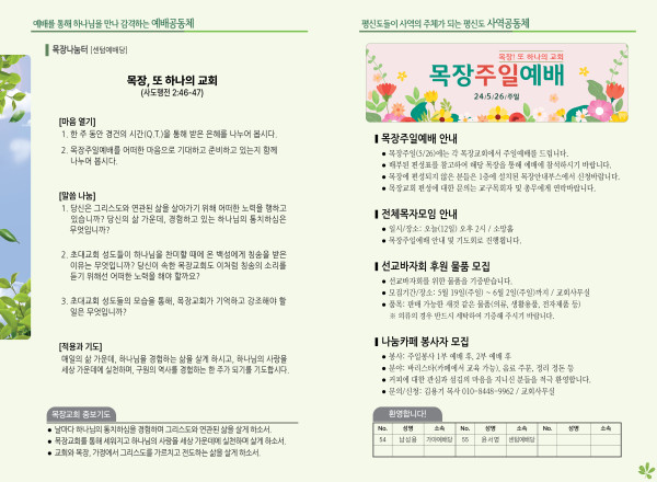 2024년 5월 12일 주보 (센텀예배당) 페이지 정보 작성자 관리지기 작성일24-05-11 10:50 조회2,561회 댓글0건 관련링크 목록 본문 2024년 5월 12일 주보 (센텀예배당) 댓글목록 등록된 댓글이 없습니다. 목록