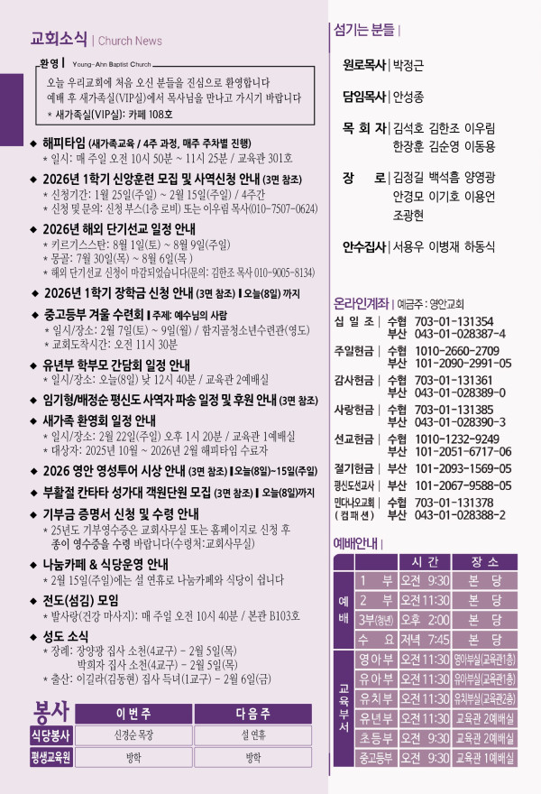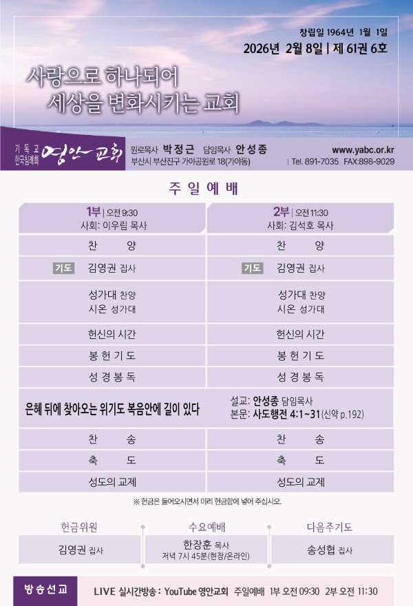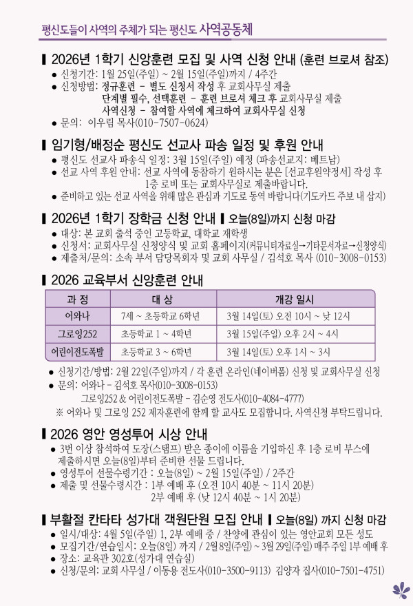 2026년 2월 8일 주보 페이지 정보 작성자 관리지기 작성일26-02-07 11:08 조회832회 댓글0건 관련링크 목록 본문 2026년 2월 8일 주보 댓글목록 등록된 댓글이 없습니다. 목록