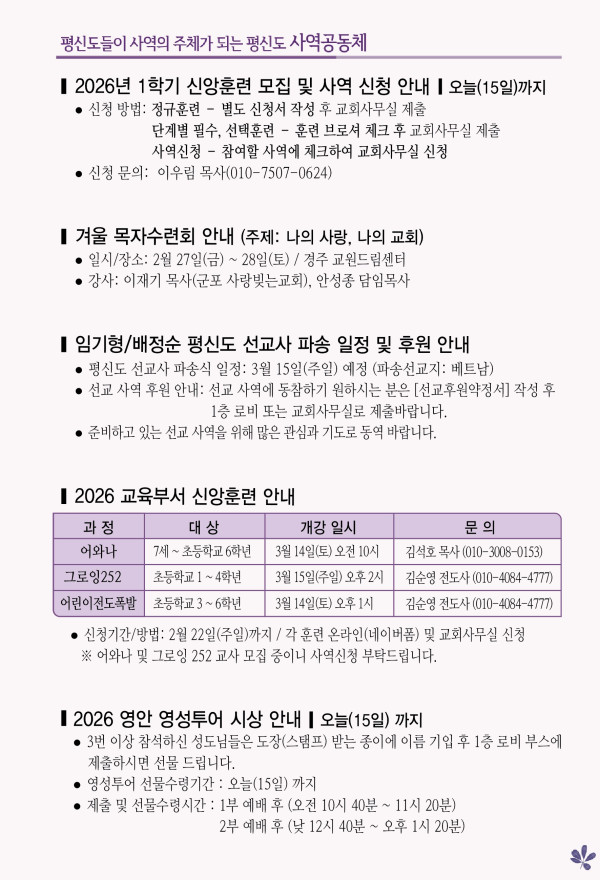 2026년 2월 15일 주보 페이지 정보 작성자 관리지기 작성일26-02-14 10:06 조회910회 댓글0건 관련링크 목록 본문 2026년 2월 15일 주보 댓글목록 등록된 댓글이 없습니다. 목록
